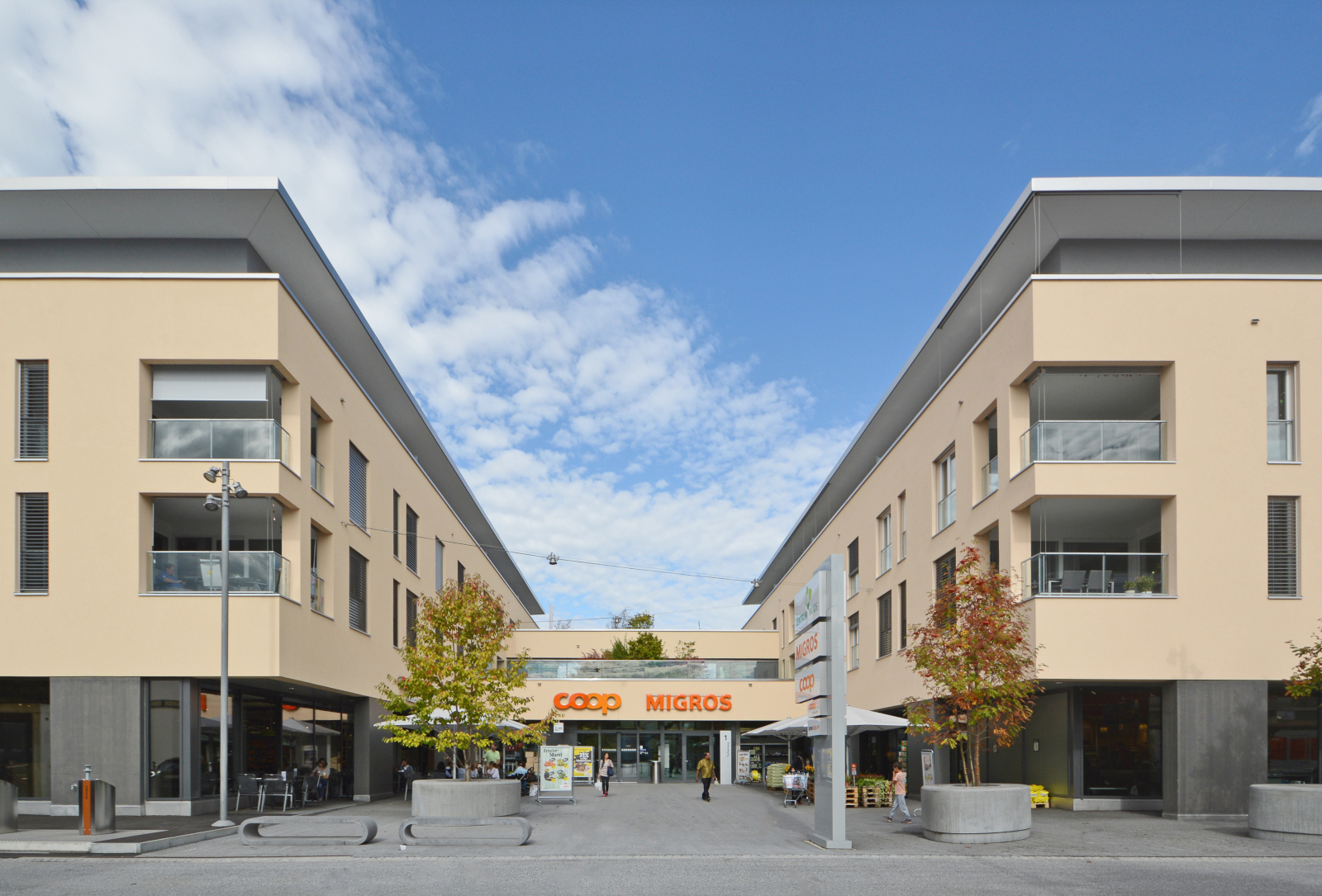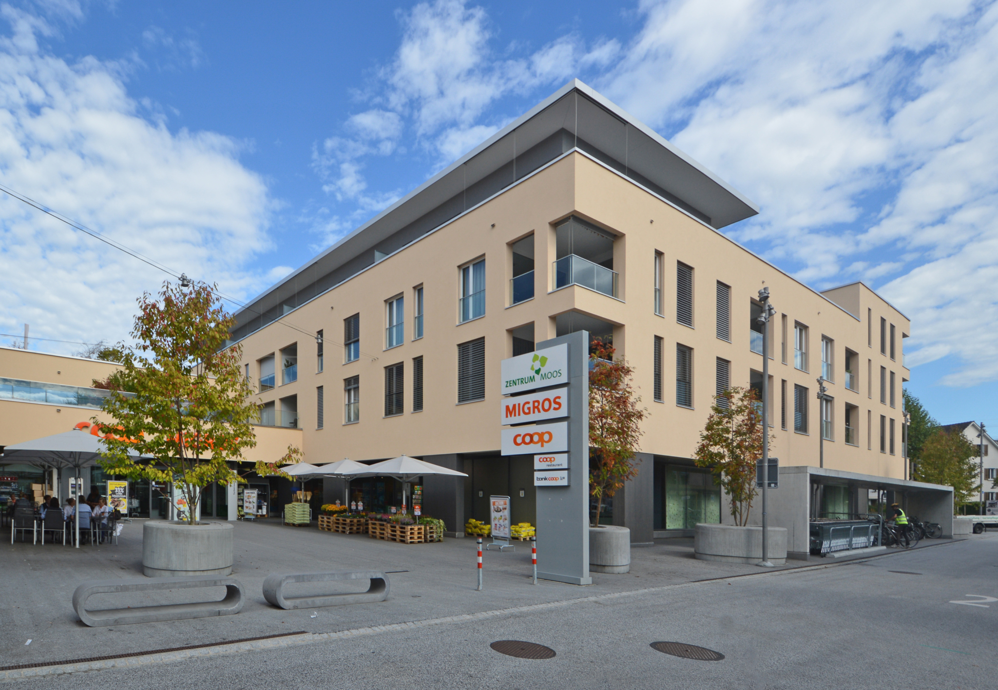 Wohn- und Geschäftshäuser Zentrum Moos in Gümligen. Überbauung mit Wohnungen und Verkaufsflächen für die Detaillisten Migros und Coop sowie Gestaltung eines attraktiven öffentlichen Aussenraumes.