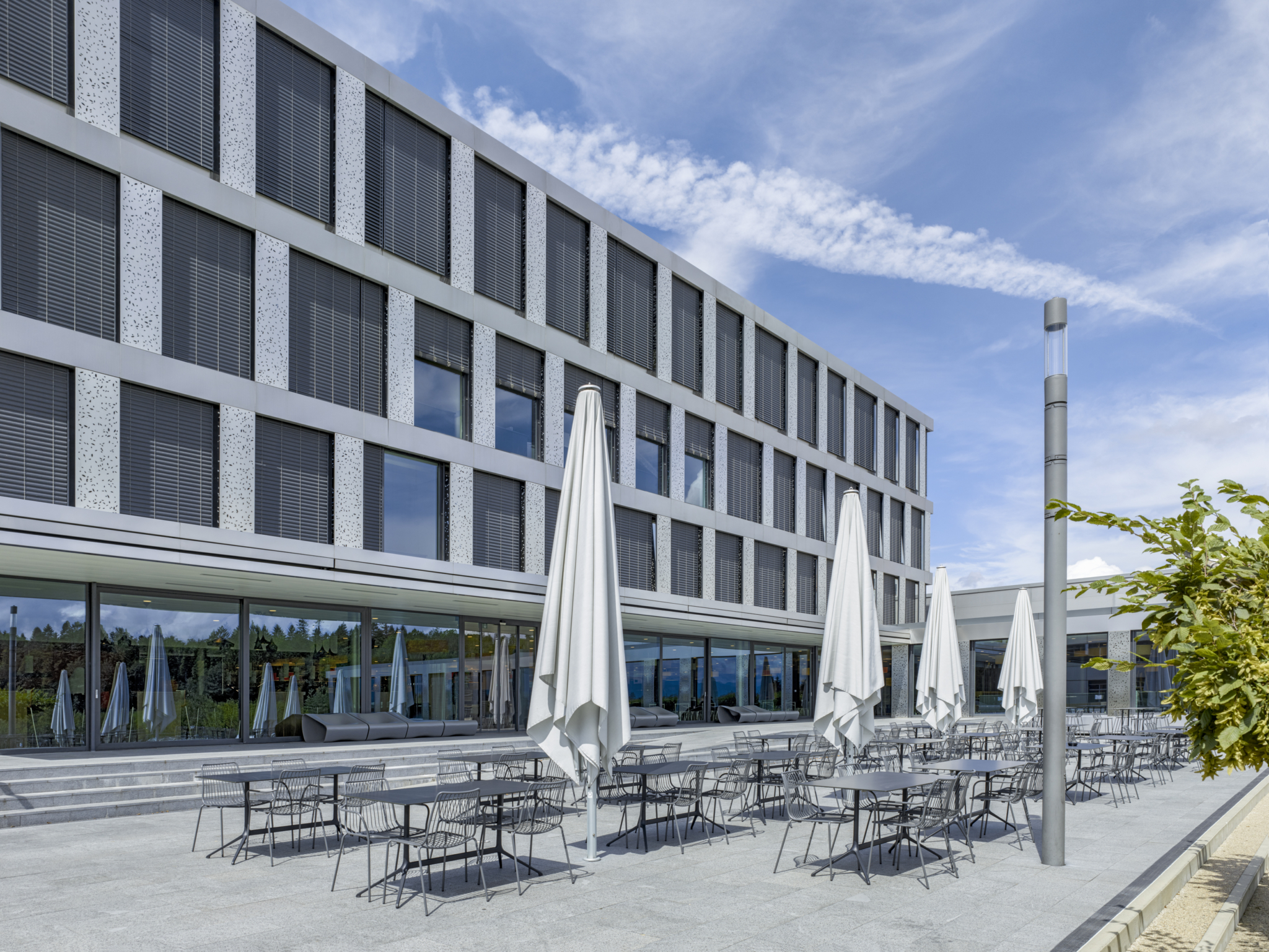 Die Hotelfachschule erhält mit dem Erweiterungsbau in der 1. Phase ein markanteres Gesicht gegen die Hauptzugangsstrasse. Der EHL fehlten bisher Aussenräume mit unterschiedlichen Qualitäten für besondere Nutzungen. Unser Anbau kreiert zwei neue Aussenräume (Eingangshof und Lesehof).
