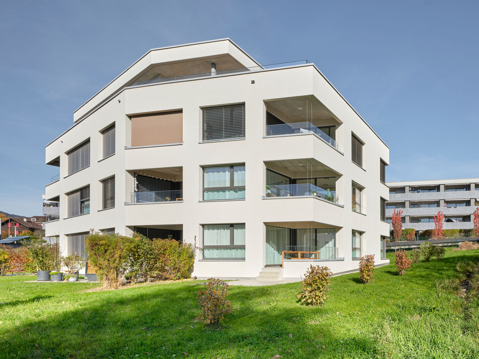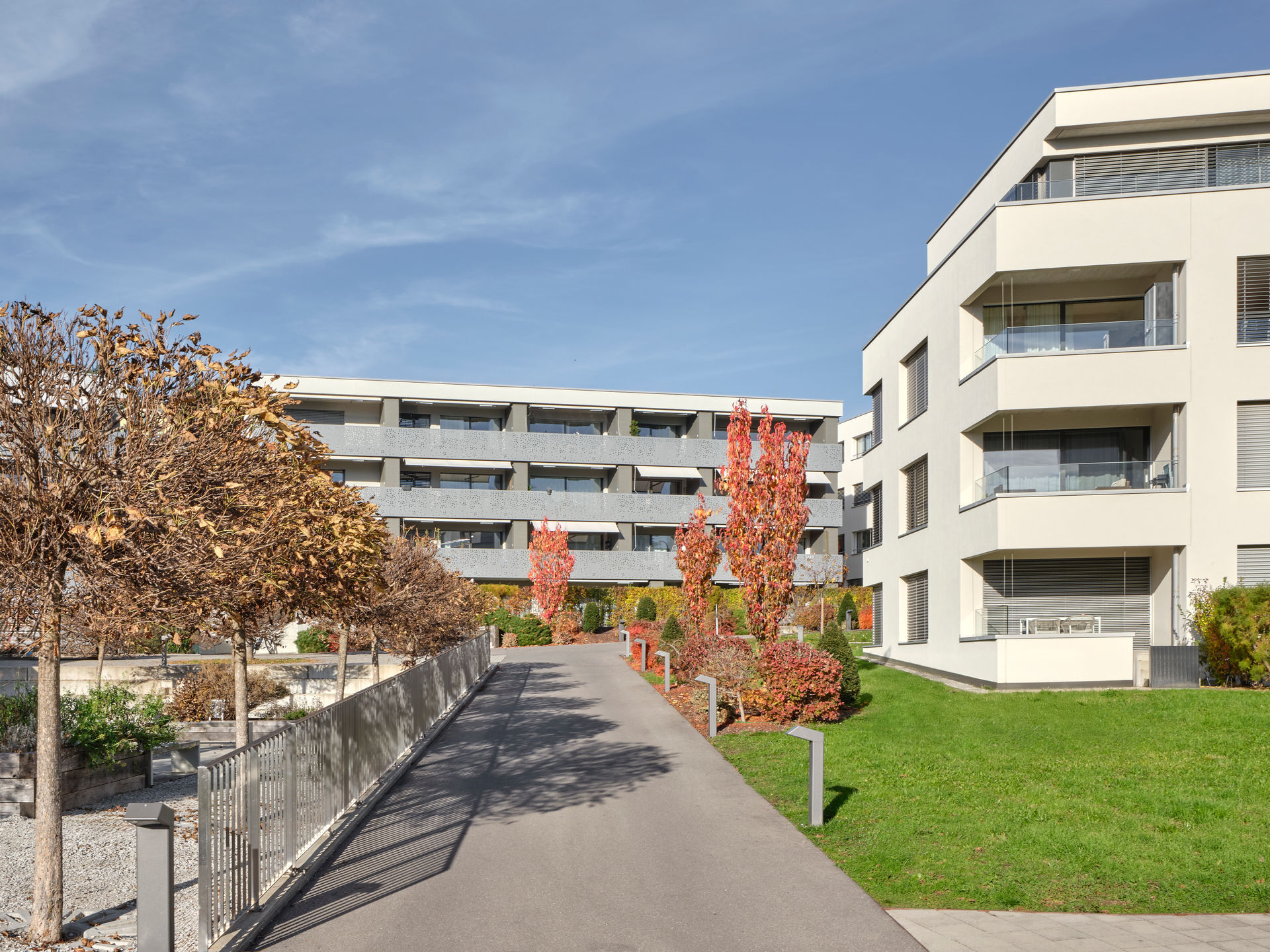 An einem Südhang über dem Genfersee entstand eine Wohnsiedlung mit ca. 150 Mietwohnungen in verschiedener Grösse und Qualität mit vorzüglicher Aussicht auf Berge und See.