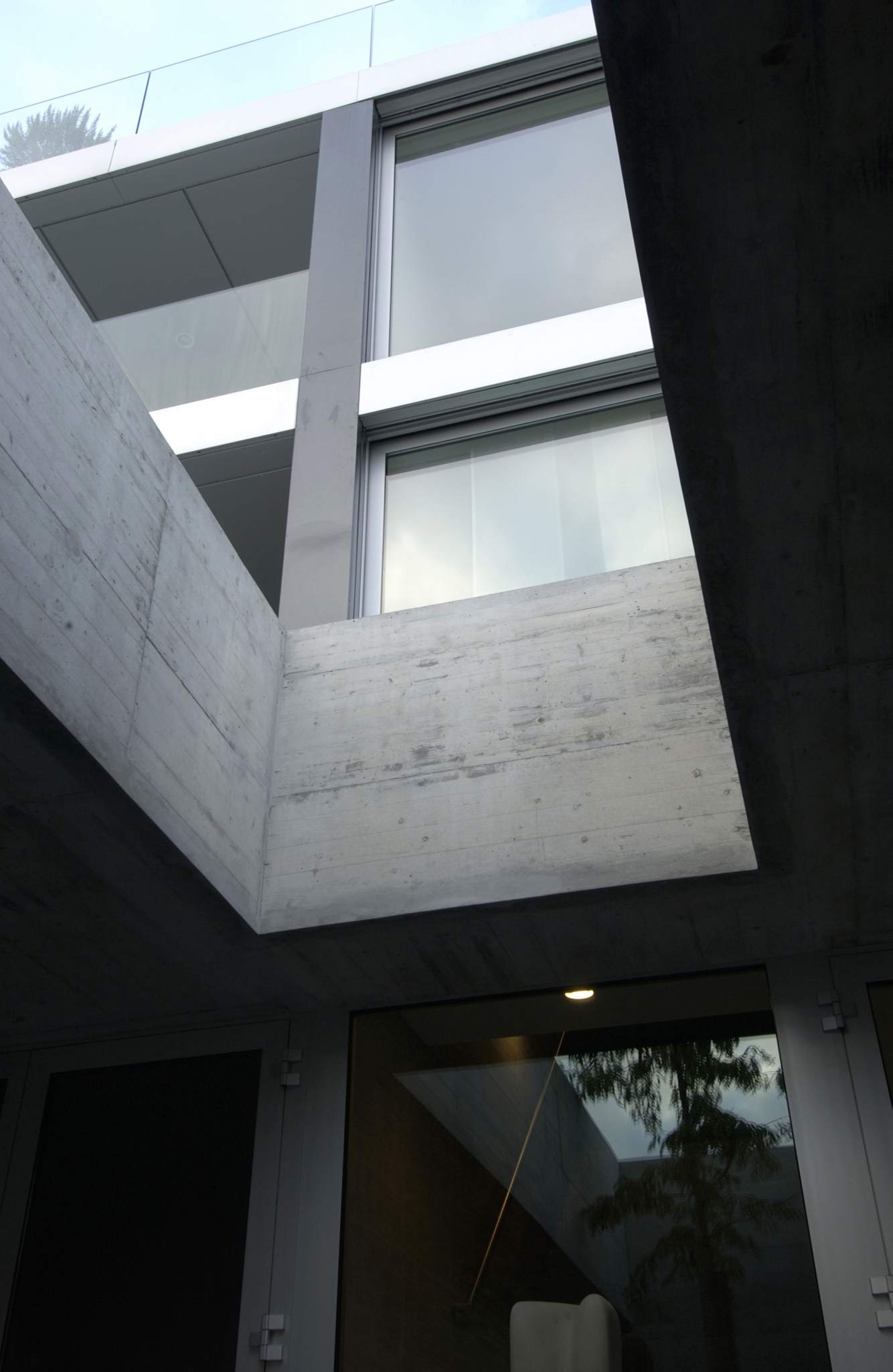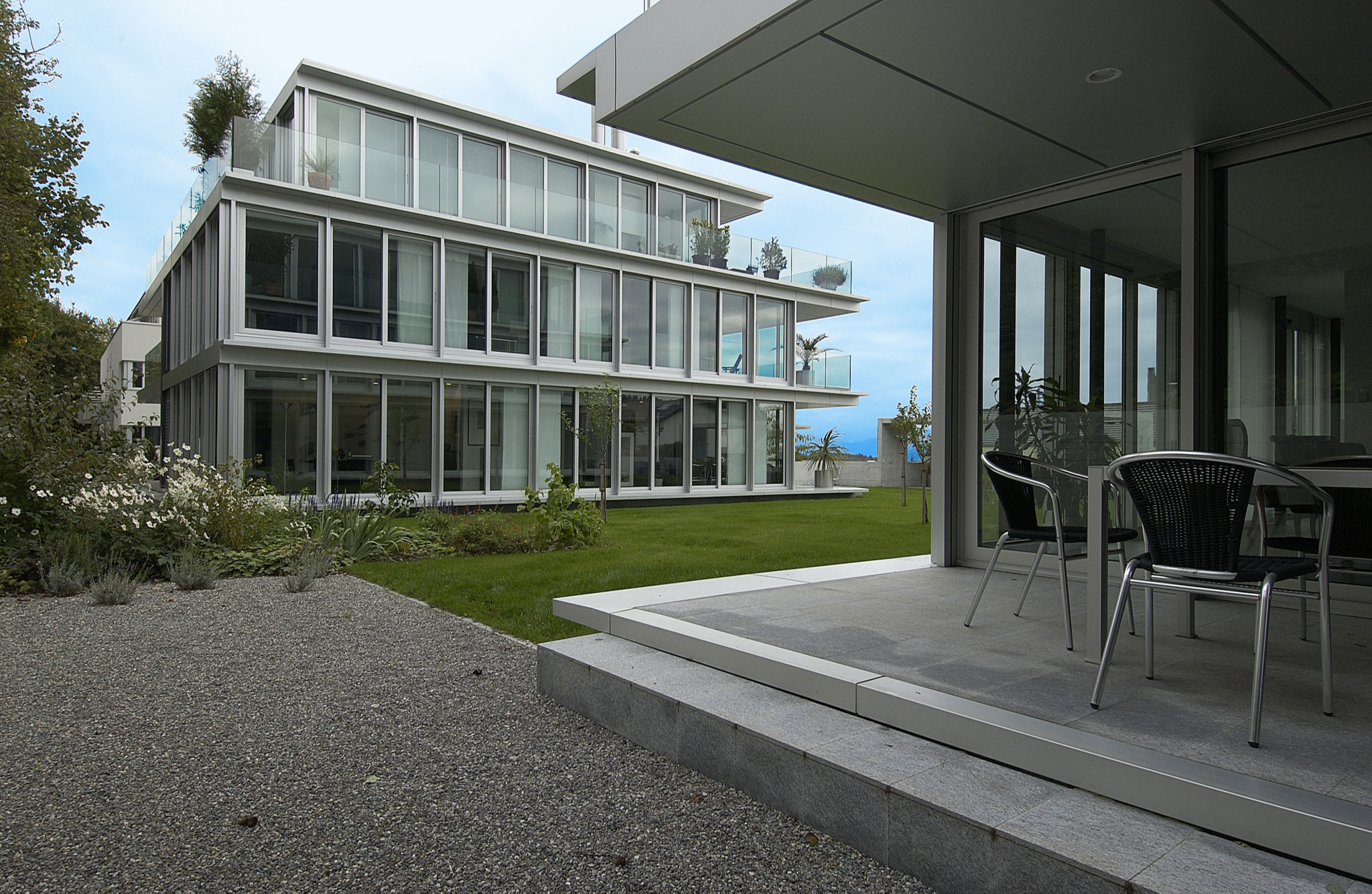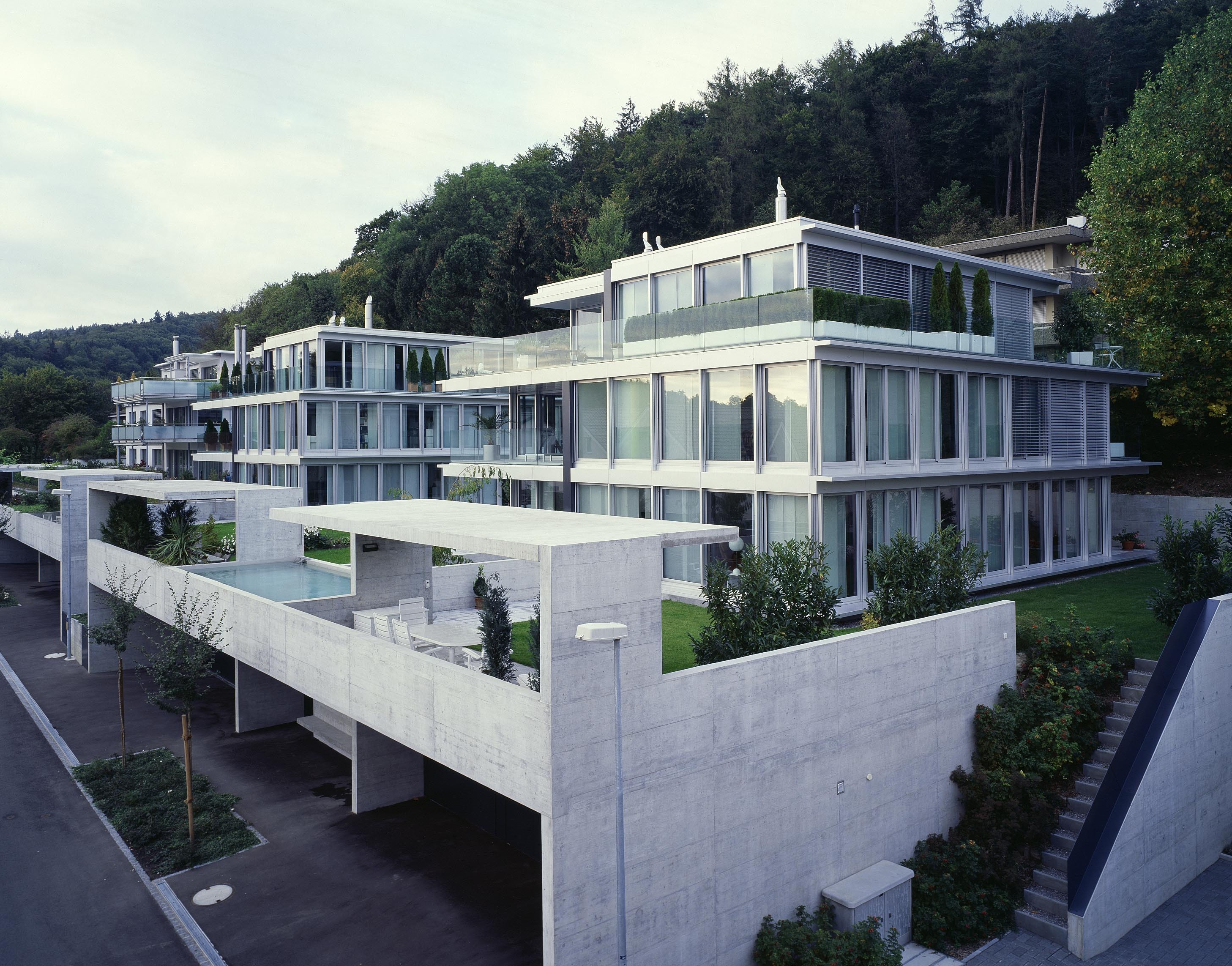Zwei Glaskörper mit je zwei Maisonette- und einer Attikawohnung stehen auf einem gemeinsamen Betonsockel. Individuelle Gestaltung der Grundrisse der einzelnen Wohnungen aufgrund des klaren Strukturrasters.