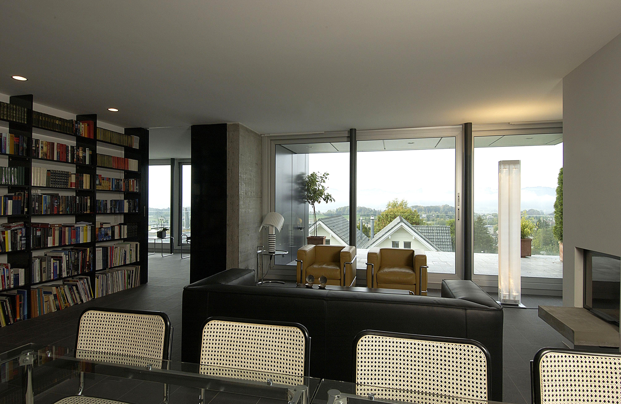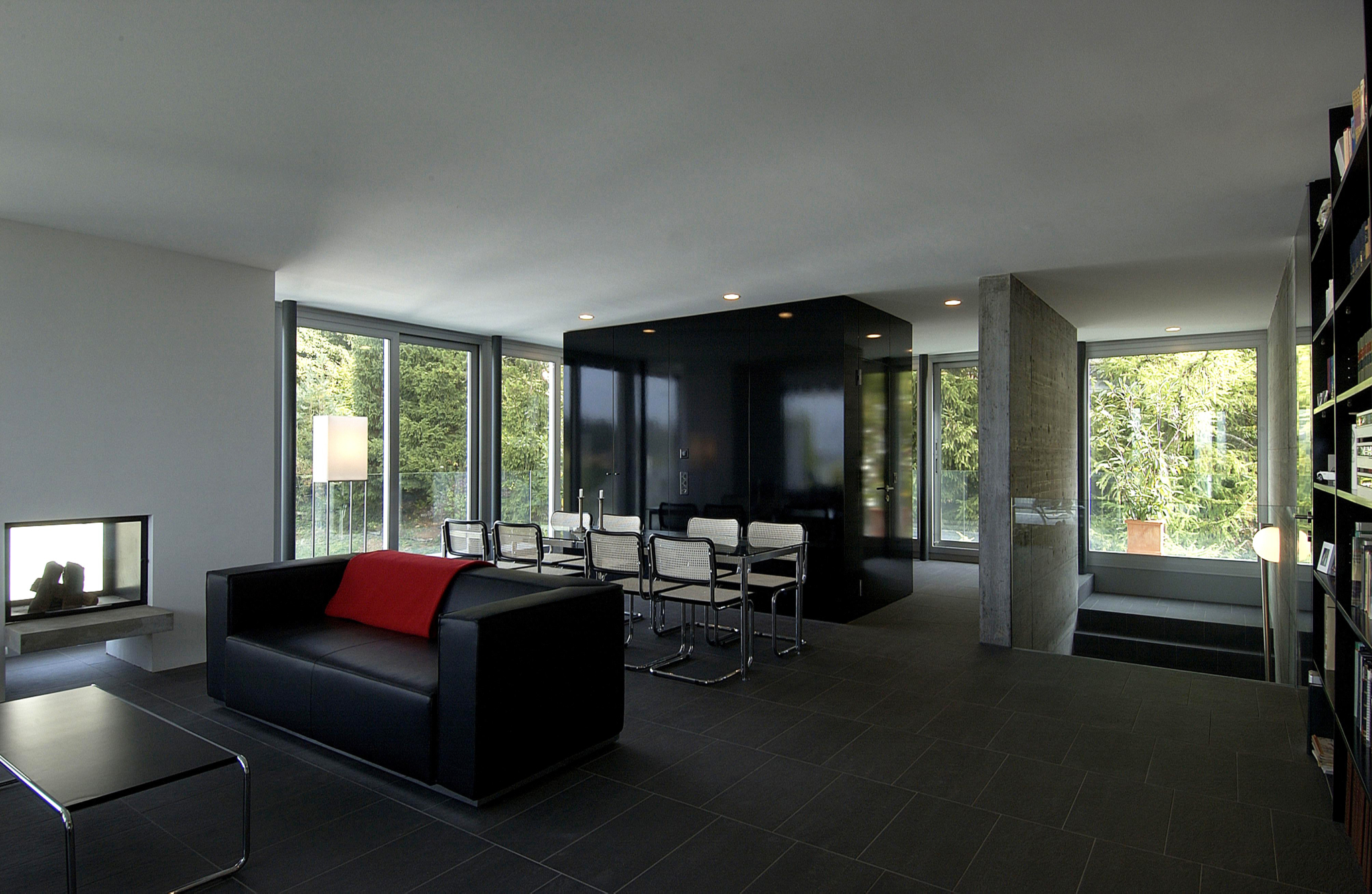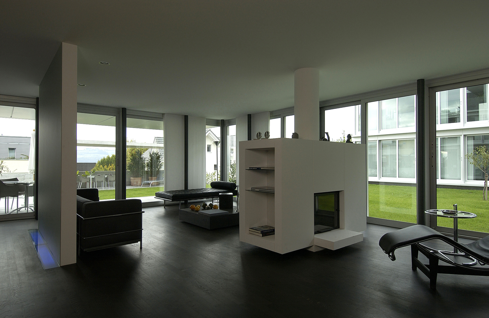 Zwei Glaskörper mit je zwei Maisonette- und einer Attikawohnung stehen auf einem gemeinsamen Betonsockel. Individuelle Gestaltung der Grundrisse der einzelnen Wohnungen aufgrund des klaren Strukturrasters.